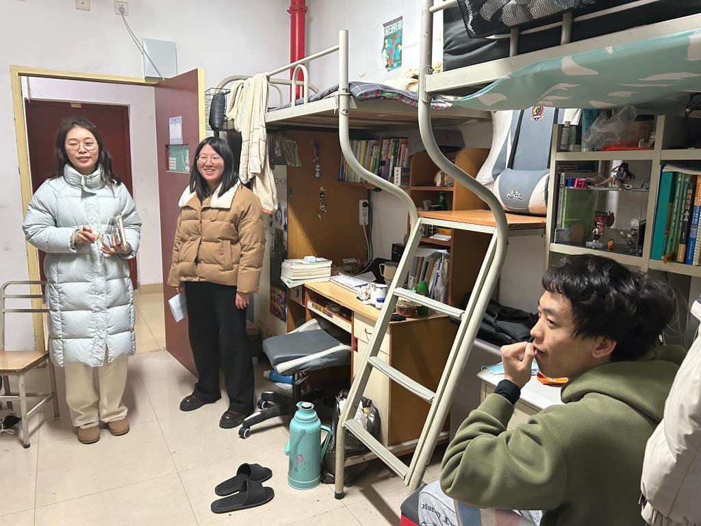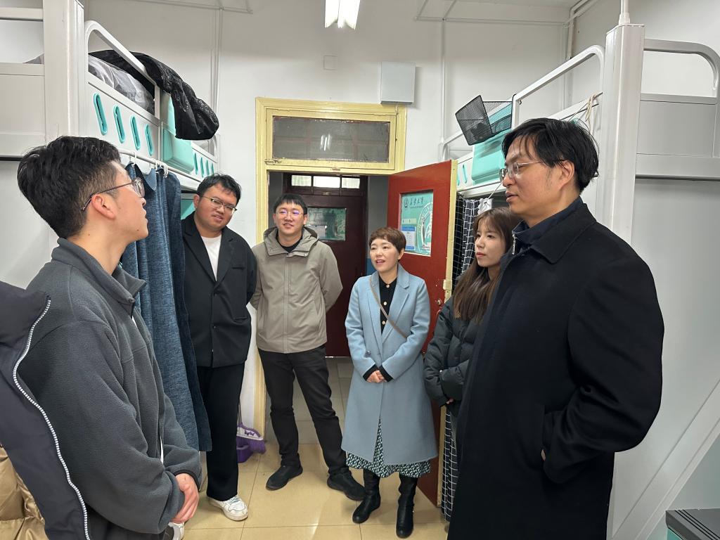 学院院长陈昊、党委副书记倪凤英带队前往学生宿舍进行走访调研,了解学生假期学生生活情况、考研成绩及求职情况,询问学生新学期规划,掌握学生思想动态。陈昊院长鼓励同学们在新学期伊始要及时调整学习状态、聚焦学业主业,营造和谐、积极、团结的宿舍氛围。
