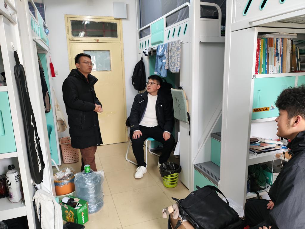 思政班主任、年级辅导员在走访过程中对宿舍卫生安全、学业困难和宿舍矛盾等方面开展隐患排查工作,对学生关于学习生活及身心健康方面的意见需求进行了回复,叮嘱同学们调整状态,以崭新的面貌迎接新学期的到来。
