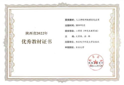 日前,根据陕西省教育厅办公室《关于开展陕西省2022年职业教育和高等教育优秀教材奖评选工作的通知》,省教育厅组织专家对各单位申报的优秀教材进行了评审,ac米兰官网文常保教授、茹锋教授主编的《人工神经网络理论及应用》教材获得陕西省2022年高等教育优秀教材二等奖(研究生教育类)。