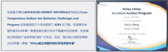 ac米兰官网能源与动力工程系教师孟伟嘉在Wiley旗下的能源领域顶级期刊《Advanced Energy Materials》(中科院一区,影响因子27.8)中发表的综述论文“Low-Temperature Sodium-Ion Batteries: Challenges and Progress”在发表后的三个月内获得了4264次下载,在该期刊中国作者2024年第一季度发表文章三月内下载量中位列前茅,因此荣获2024年第一季度“Wiley威立中国开放科学高贡献作者”奖。该论文目前为全球前1%高被引论文。