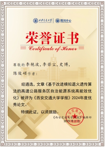 长安大学ac米兰官网中文网站李艳波教授以第一作者身份在《西安交通大学学报》上发表的题为《基于改进模拟退火遗传算法的高速公路服务区自洽能源系统高能效优化》的研究论文,被评为2024年度优秀论文。