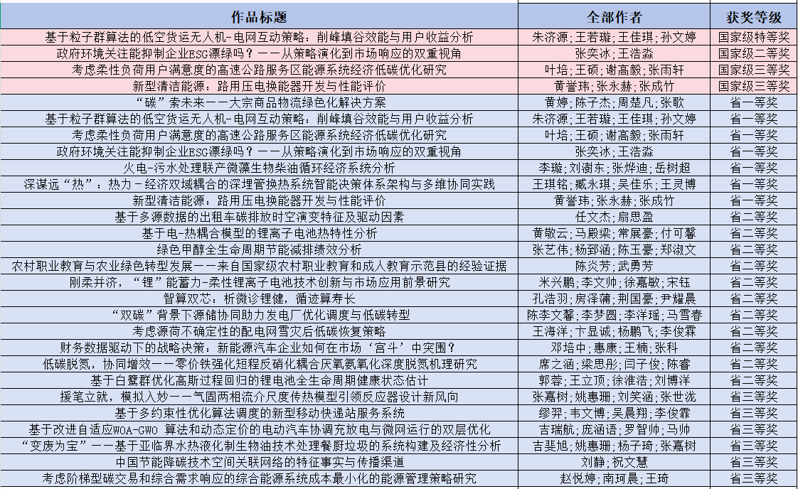 近日,第十一届全国大学生能源经济学术创意大赛圆满落幕。本届赛事共有全国724所高校16104件作品参赛,我校通过宣传报名和举办校级选拔赛共推荐29份作品参加省赛,其中7项作品晋级国赛,最终斩获国家级特等奖1项,二等奖1项,三等奖2项;获省级一等奖7项、二等奖9项、三等奖8项。