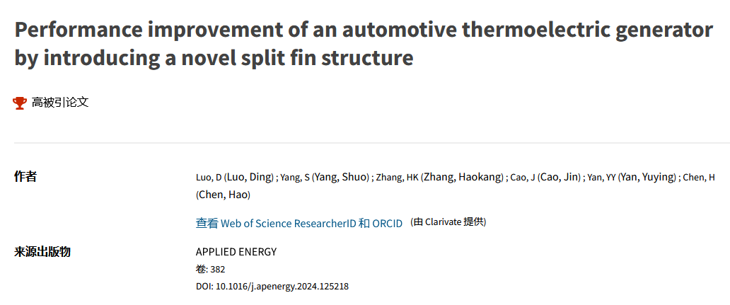 长安大学ac米兰官网中文网站罗丁副教授以第一作者身份发表在《Applied energy》上的题为《Performance improvement of an automotive thermoelectric generator by introducing a novel split fin structure》的研究论文,入选ESI高被引论文,被引频次排名前1%,该论文正式发表于2025年3月,目前被引用28次。