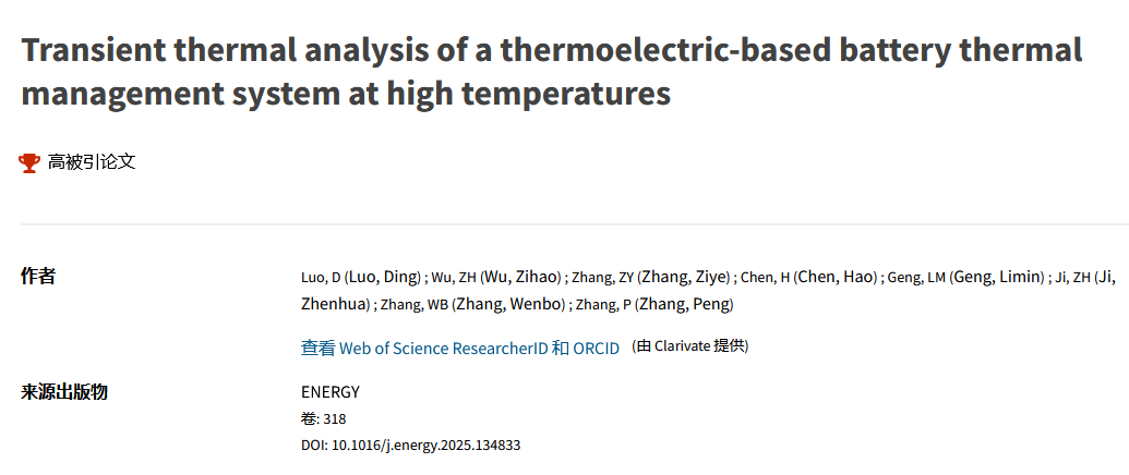 罗丁副教授以第一作者身份发表在《Energy》上的题为《Transient thermal analysis of a thermoelectric-based battery thermal management system at high temperatures》的研究论文,入选ESI高被引论文,被引频次排名前1%,该论文正式发表于2025年3月,目前被引用17次。