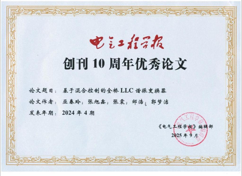 长安大学ac米兰官网中文网站张震、巫春玲副教授团队在《电气工程学报》上发表了题为《基于混合控制的全桥LLC谐振变换器》的研究论文,被评为《电气工程学报》创刊10周年优秀论文,该奖项从《电气工程学报》2015-2024年间发表的1050篇论文中评选出60篇优秀论文,巫春玲副教授为论文第一作者,张震副教授为论文通讯作者,唯一署名单位为长安大学ac米兰官网中文网站。