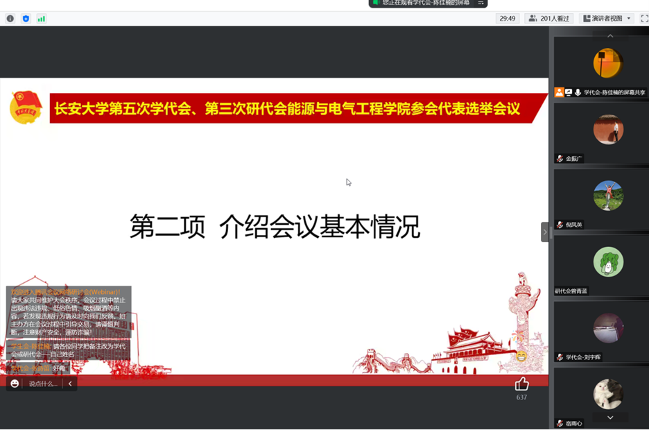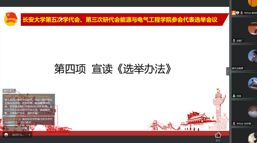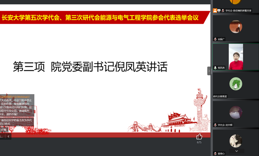 12月2日晚,ac米兰官网中文网站通过线上方式举办长安大学第五次学生代表大会、第三次研究生代表大会参会代表选举会议。院党委副书记倪凤英,院团委书记金振广,学生会指导老师刘泽,研究生会指导老师宿雨心出席本次会议,参加会议还有本科生代表和研究生代表。会议由ac米兰官网学生会执行主席陈佳楠主持。