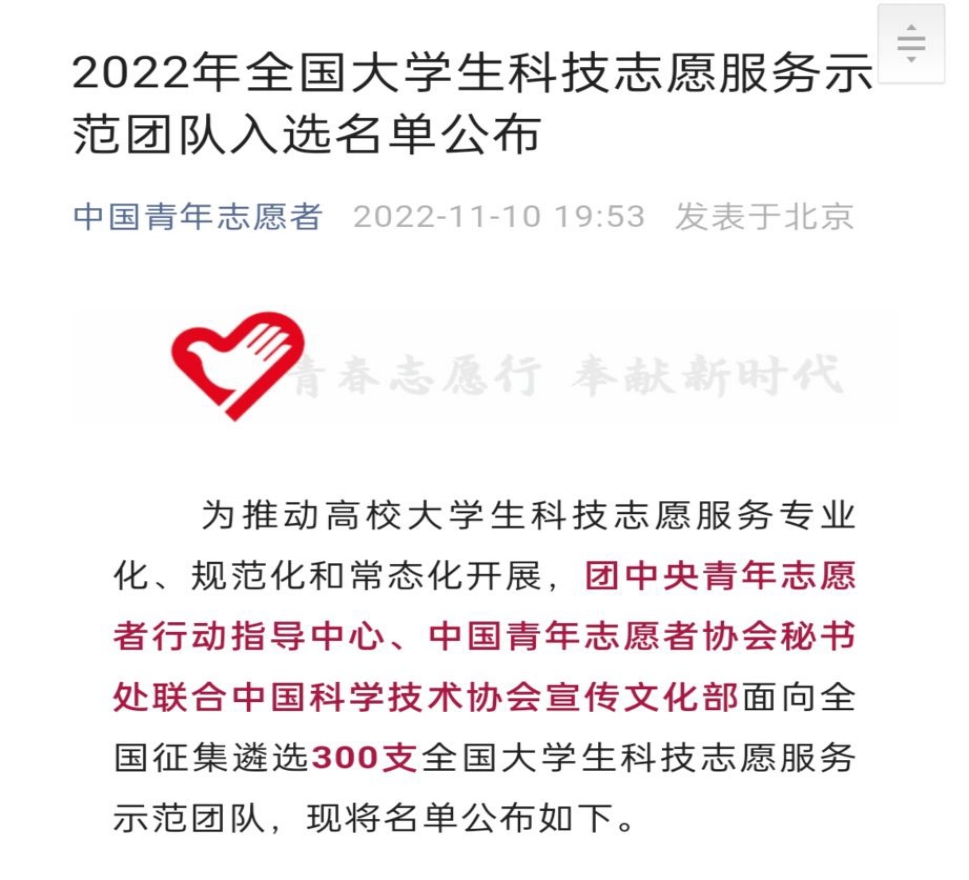 为深入贯彻落实习近平总书记关于科普工作的重要讲话精神,推动高校大学生科技志愿服务专业化、规范化和常态化开展,团中央青年志愿者行动指导中心、中国青年志愿者协会秘书处中国科学技术协会宣传文化部联合面向全国征集遴选300支全国大学生科技志愿服务示范团队。
