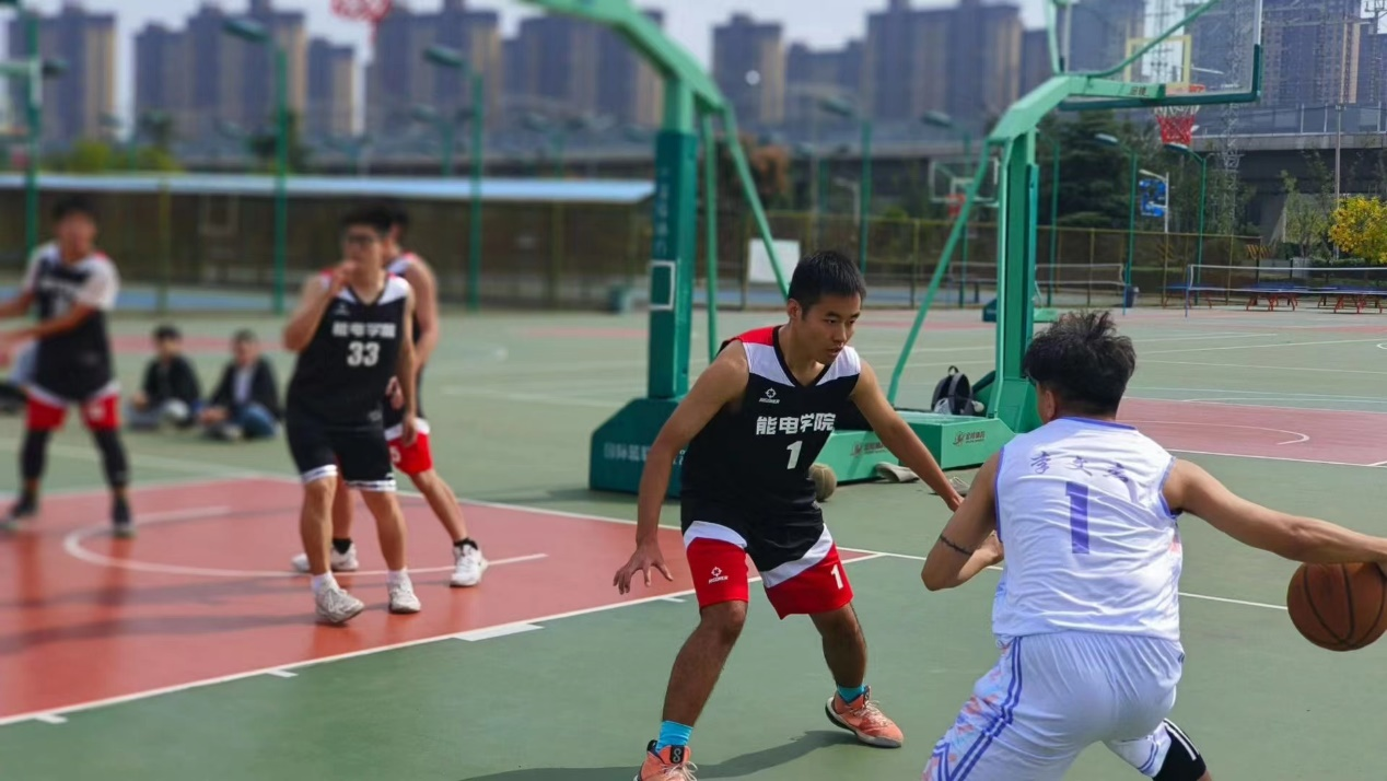 随着裁判哨声响起,能电青年们争先恐后地夺下首球,一刹那间场下响起铺天盖地的加油声和欢呼声。运球、变向、突破、上篮......球员们在对方夹缝中穿梭向前、张开双臂拼命死守、全力以赴飞身救球......上半场22级同学以16:9的比分赢下第一小节,第二小节23级队员们奋起直追,将比分扳平到30:30,大家奋力拼搏的身影成为了操场一道靓丽的风景。