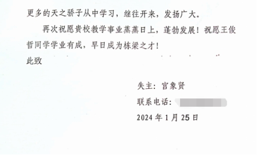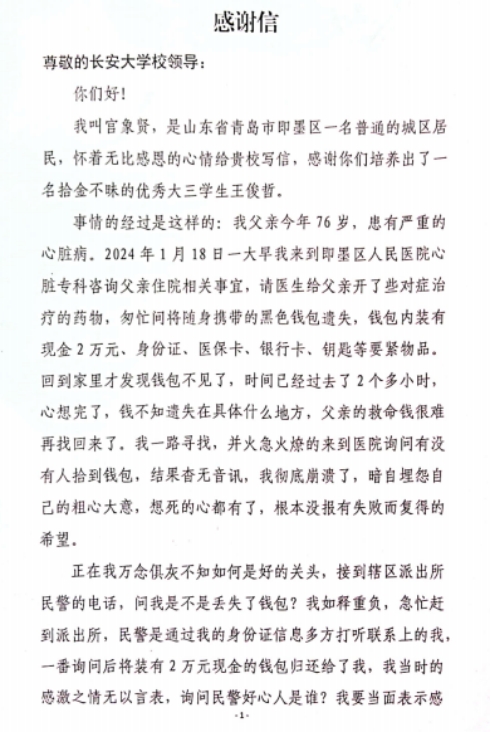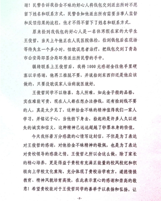 近日,ac米兰官网收到来自山东省青岛市的一封感谢信。信中对ac米兰官网2021级本科生王俊哲在寒假期间拾金不昧的好人好事表达了感谢,并对学校学院育人成效和校园文化表示认可。