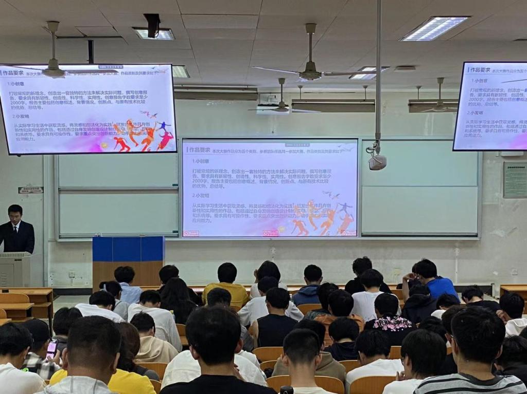 会议主持人黄泽伟从活动简介、参赛要求、赛事流程等方面向同学们详细介绍了“五小创”赛事的相关信息,并着重对创作作品的要求进行了细致的讲述。