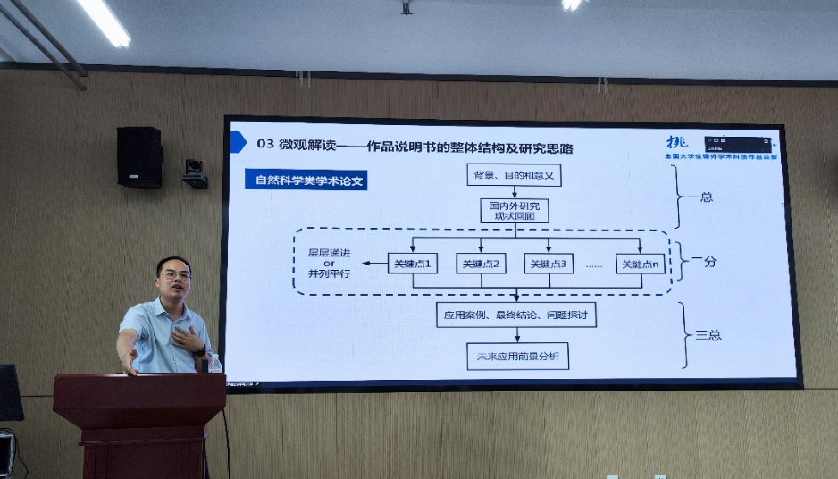 校团委创新创业实践中心主任石涌泉作了题为《“挑战杯”竞赛理工科作品参赛要点解析》的培训。他从“挑战杯”竞赛的起源和发展现状、学校历年获奖作品情况、竞赛奖励与资助办法、“三级四维”保障体系等方面介绍了学校开展创新创业教育相关工作的基本情况。同时他从宏观、中观、微观三个方面,围绕比赛的选题申报、学术规范、参赛技巧等重点内容对比赛进行了全方面的解读。