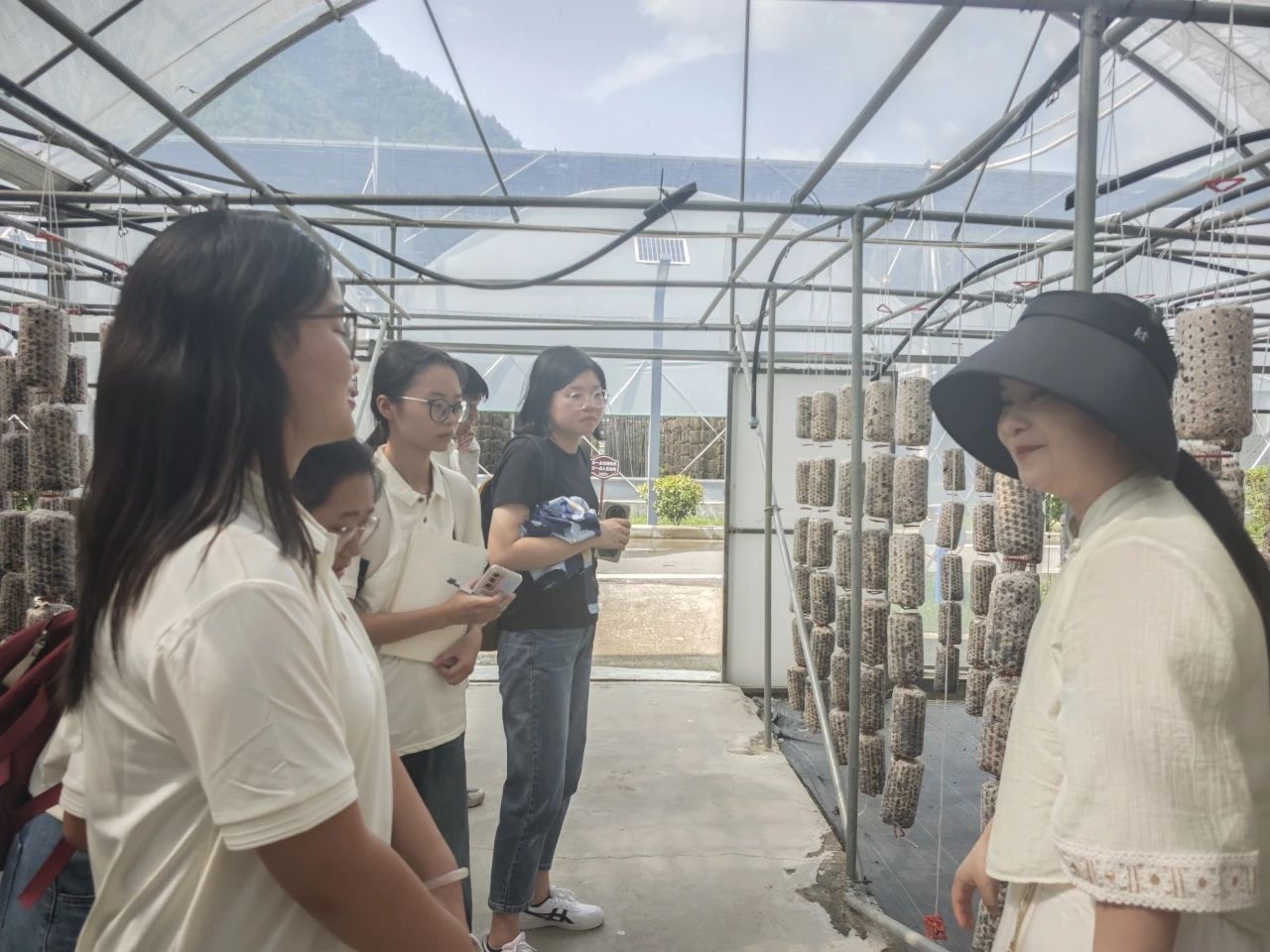 实践团队首先前往了金米村的木耳大棚,负责人程培培带着团队成员穿行在整齐排列的木耳大棚间,一边走一边细致地介绍:从木耳的菌种培育、培养基的调配,到不同生长阶段的温湿度控制;从病虫害防治的绿色技术,到木耳采摘最佳时机的判断标准;乃至产品后期烘干的工艺细节都作了专业而细致的说明。团队成员们听得专注,不时就种植过程中的疑问向负责人程培培请教,对木耳从“菌”到“菜”的全过程有了清晰的认识。