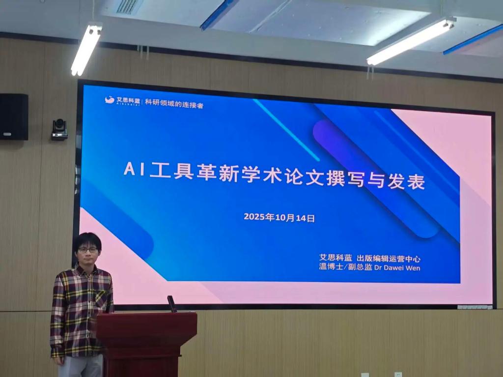 为积极响应国家关于人工智能赋能教育发展的战略部署,引导师生科学、高效地运用智能工具,10月14日,ac米兰官网成功举办了以“AI工具革新学术论文撰写与发表”为主题的讲座。本次讲座特邀艾思科蓝出版编辑部温大尉总监担任主讲,吸引了众多师生踊跃参与。