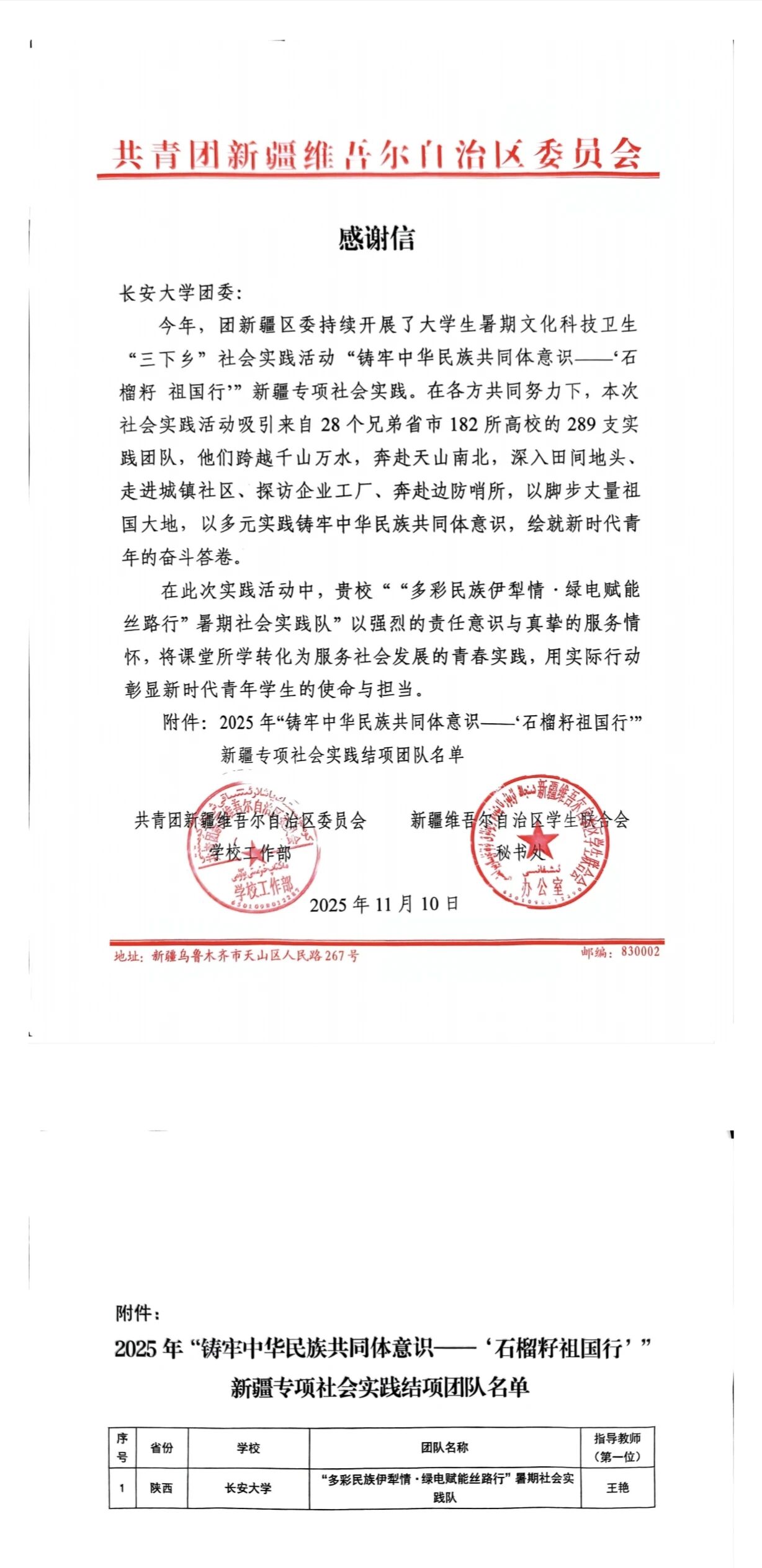 近日,共青团新疆维吾尔自治区委员会向ac米兰官网实践队发来感谢信,对ac米兰官网“多彩民族伊犁情·绿电赋能丝路行”社会实践队在2025年大学生暑期文化科技卫生“三下乡”社会实践活动“铸牢中华民族共同体意识—‘石榴籽 祖国行’”新疆专项社会实践中作出的积极贡献予以表扬和感谢!